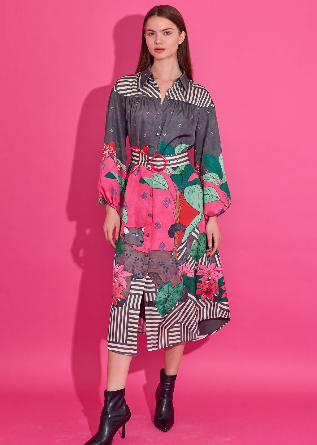 You will be the definition of trendy yet glamorous in our Jane Dress--all that's missing is your favorite pair of heels and fun earrings! The Jane is a loose fitting button down frock with long sleeves and a tie belt for a more fitted look.