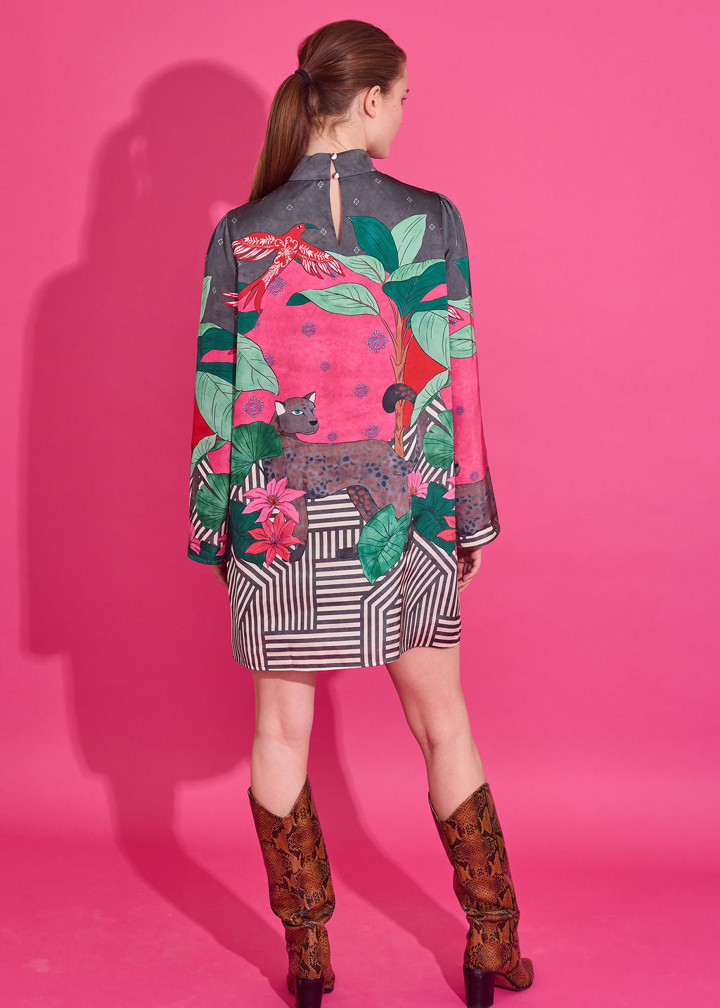 The Emery Dress is a vibrant mini that captures attention with its colony stripe print. Featuring a relaxed silhouette with a gathered neckline and long sleeves, it balances playful prints with effortless elegance. Style it with boots or heels for a standout look that transitions seamlessly from day to night.
