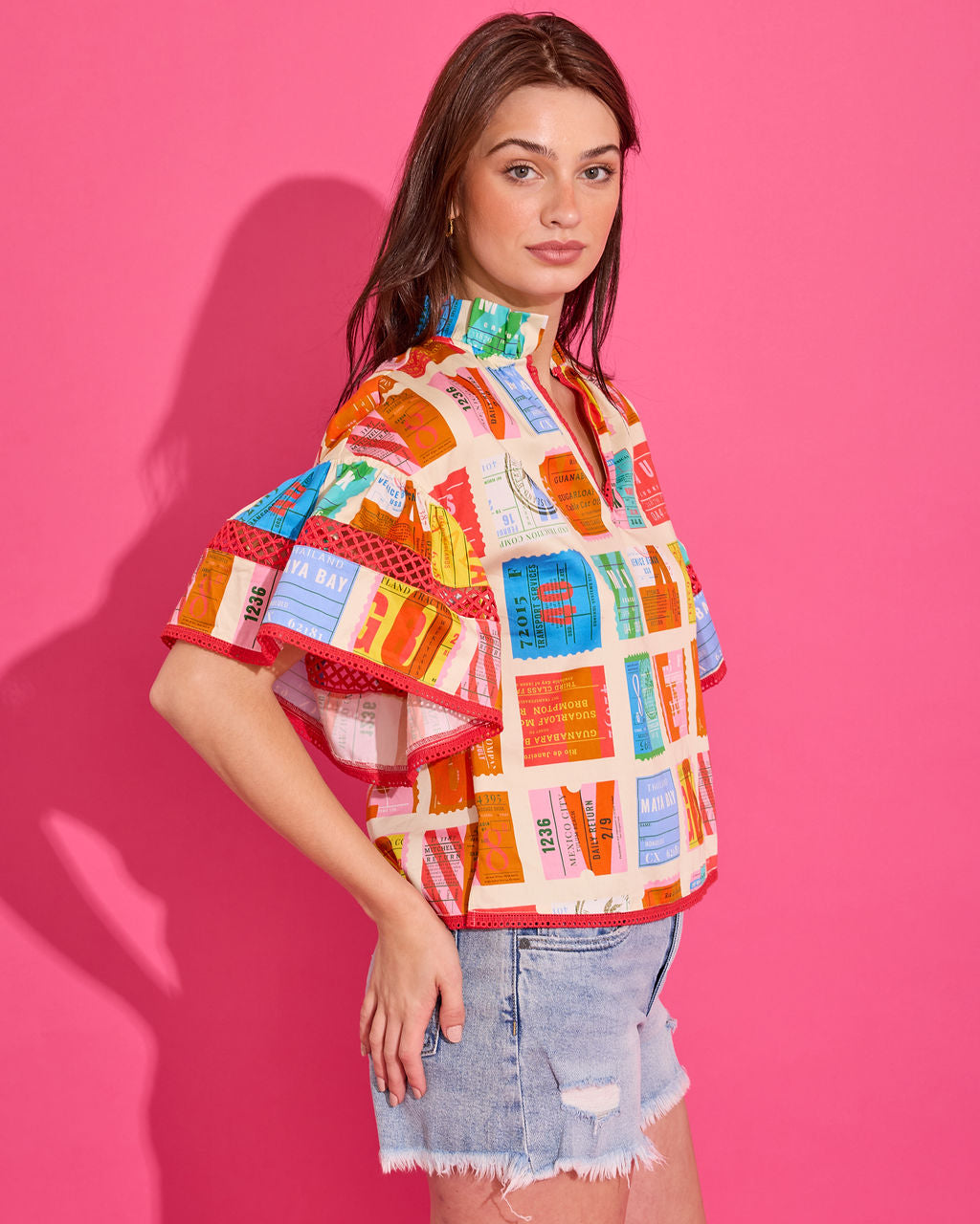 The June Top is the perfect blend of feminine charm and sophistication. Featuring a short ruched collar and a flattering V-neckline, it offers a soft yet structured silhouette. The tiered sleeves add volume and movement, with intricate lattice trim detailing.
